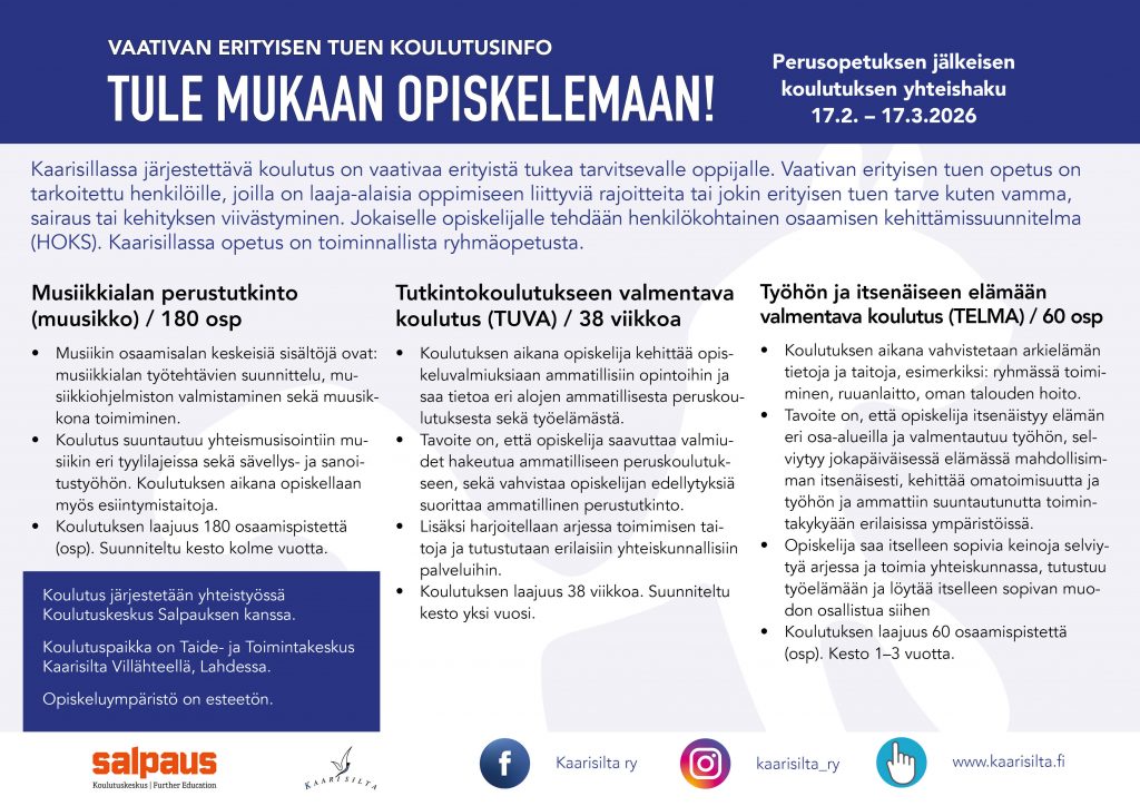Koulutusinfot on tarkoitettu kaikille Kaarisillan koulutuksista kiinnostuneille. Kerromme koulutuksista ja niihin hakemisesta ja käymme läpi yleisiä asioita oppilaitoksesta ja opiskelusta. Esittelyn jälkeen vierailemme opetustiloissa ja teillä on mahdollisuus esittää kysymyksiä opettajille ja tutustua tarkemmin koulutukseen ja opetussuunnitelmaan. Koulutusinfoissa keskitytään erityisesti keväällä 2026 yhteishakuun tuleviin koulutuksiin. Kevään 2026 yhteishaku syksyllä 2026 alkavaan perusopetuksen jälkeiseen koulutukseen on 17.2. – 17.3.2026.